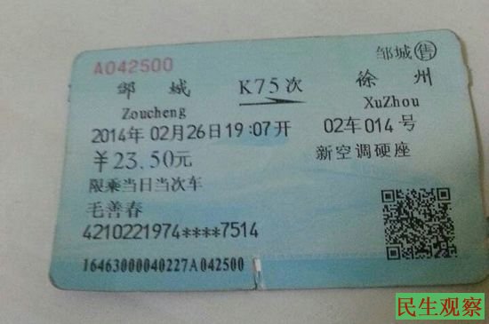 上图为:今晚毛善春遭警察殴打后强制遣送的火车票