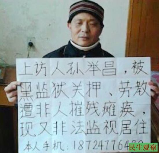 据了解,孙举昌,1966年生,家住山东省(青岛)即墨市王村镇黄庵村152号,他因早年遭遇强拆而多次上访维权,结果,他们当地的维稳人员、贪腐黑官就殴打迫害他(遭非法关押三年),导致他身受重伤部分残疾。为此,他们夫妇多次想办法逃脱维稳监控抵达北京上访,但是,在2012年的4月25日晚上,他们再次在北京被抓,之后,他们被送往北京久敬庄救助中心后,后又被青岛市驻京办雇佣的保安把他们强行押回青岛,到了青岛,他们又被送到公安局非法拘禁三十小时,随后,公安局又将她们送回家中进行监控,并且在其家门口的电线杆上架设了监控探头,以及在其家门口建造了简易房,让警察、社会闲散人员等数人轮流看守他们,对他们开始实施更加严格的非法稳控。