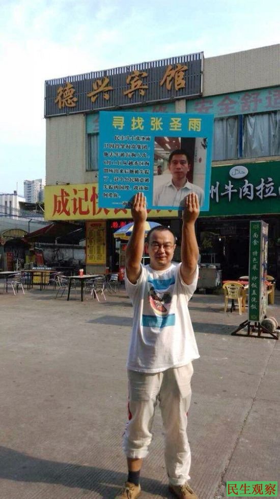 广州民主维权人士谢文飞,因久寻张圣雨未果,就于昨日开始在互联网上刊发广告称:从即日起,我将专职寻找张圣雨,凡我所能到达的地方,包括(但不限于)广州地区的各个派出所、拘留所、看守所、公园、政府门口等处,我将在这些地方以醒目的方式全力寻找张圣雨,直至找到为止。