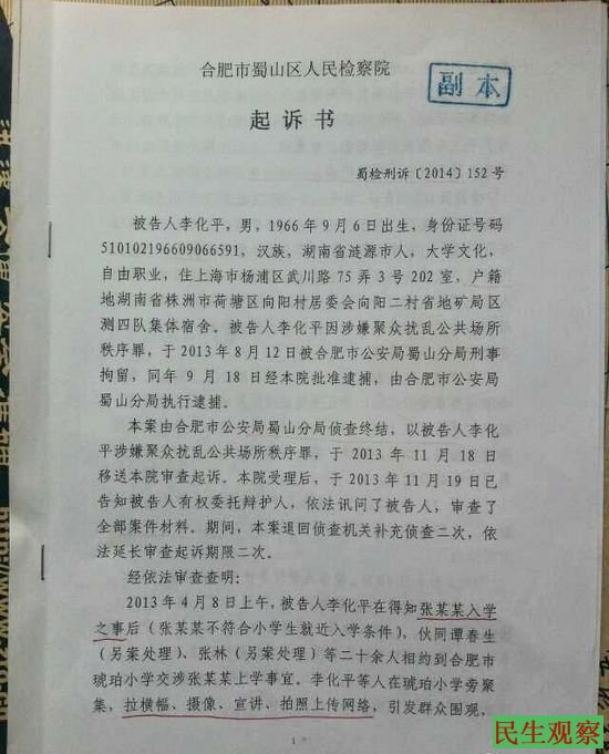 民生观察工作室2014年7月30日消息:上海知名民主维权人士李化平涉“聚众扰乱公共场所秩序”案今在合肥开庭。