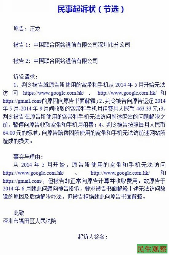 深圳汪龙控告联通屏蔽google被警方扣押到派出所近四小时