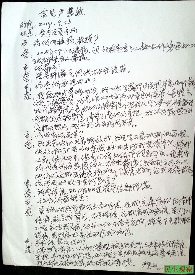 民生观察网2014-9-29消息:9月16日,本网发布了上海维权人士尹慧敏被以寻衅滋事罪关押 期待律师介入(