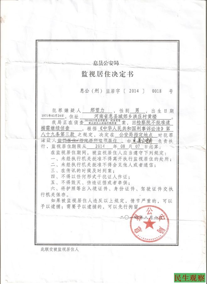 邢望力监视居住通知书