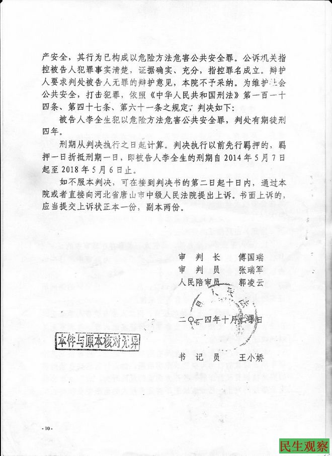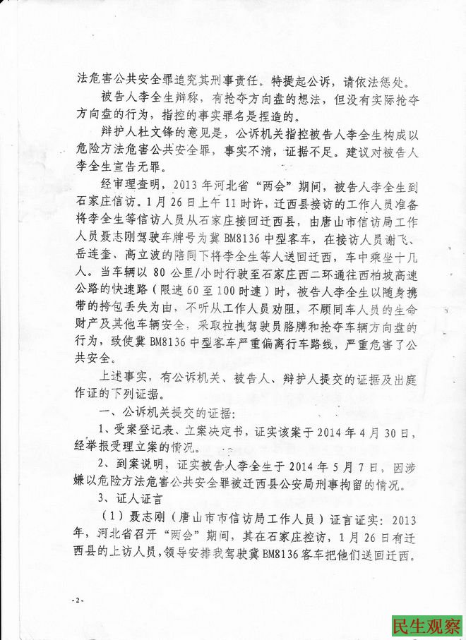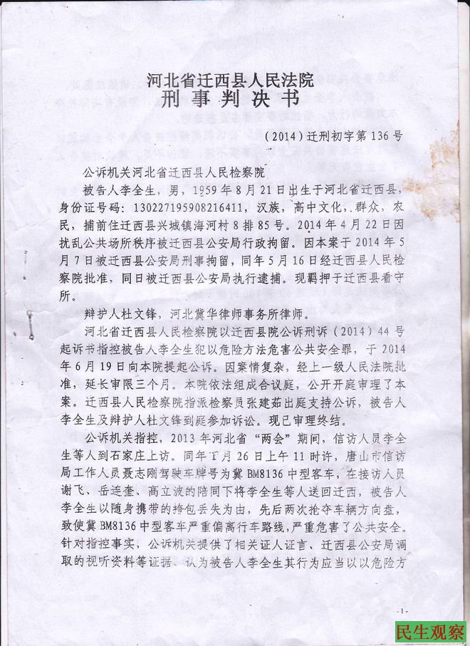 河北迁西访民李全生抢夺截访车辆方向盘被判刑四年