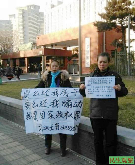民生观察工作室2014-12-4消息:继前天(12月2日),本工作室报道了武汉公民王芳(女)在中共中央党校门前举牌维权(详见:《武汉公民王芳 中共中央党校前举牌维权》http://aaa.aetdhfjgk.cf/a/lanmu9/2014/1202/11389.html)后,今天王芳再次来到中央电视台、新华社等地举牌维权。至今天上午11时许,王芳被多名警察抓住并拉上警车送到了北京久敬庄接济服务中心。