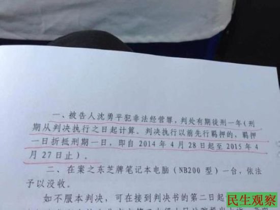 对此,沈勇平的代理律师张雪忠先生表示:“公民沈勇平,因摄制八集纪录片《百年宪政》的公益行为被控非法经营一案,今在北京巿朝阳区人民法院宣判。沈勇平一审获刑一年。对沈勇平的任何有罪判决,燕薪律师和我都不会认同,但考虑到当事人只有4个多月便可获释,我们仍略感欣慰。沈勇平先生是第一个因纪录中国宪政历程而失去自由的人。”