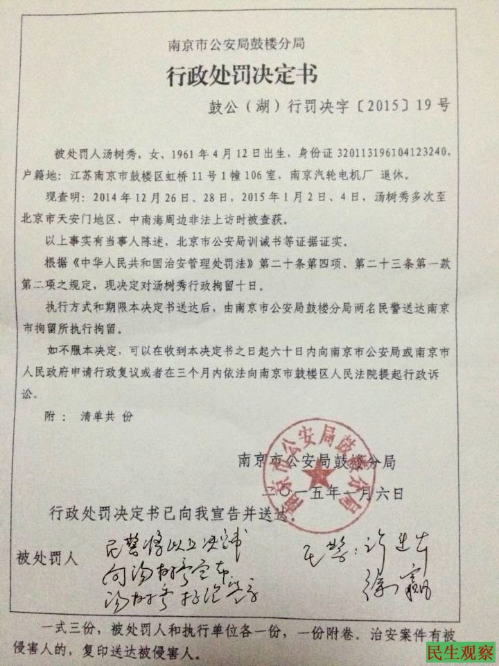 第二天(1月6日),汤树秀再被南京警方以其“非法上访”为由,处以行政拘留十日处罚。