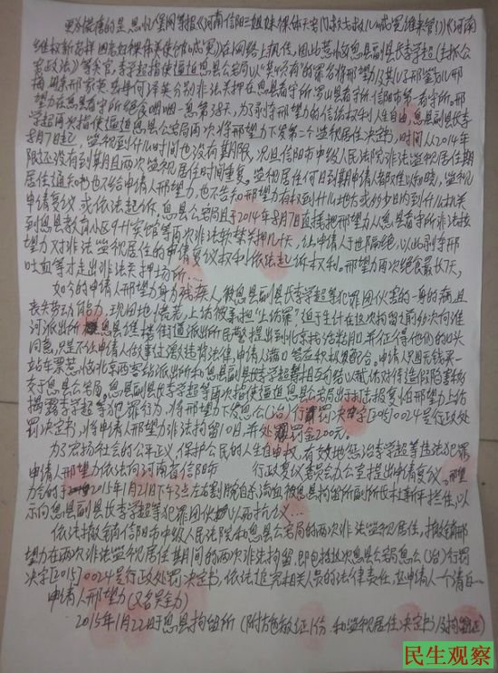 民生观察工作室2015/1/24日消息:河南省信阳市息县公民邢望力(又名—吴全力)于2015年1月15日在北京期间被警方抓住,送回老家后遭行政拘留十天。邢望力委托儿子邢鉴向信阳市人民政府申请行政复议。1月23日上午11点左右,邢鉴前往信阳市委政府3号楼308房行政复议委员会办公室申请复议,结果招来对方刁难,一个行政复议办公室的中年男子表示,出示授权委托书,还要出示父子关系证明,并告知行政起诉法院不会受理。