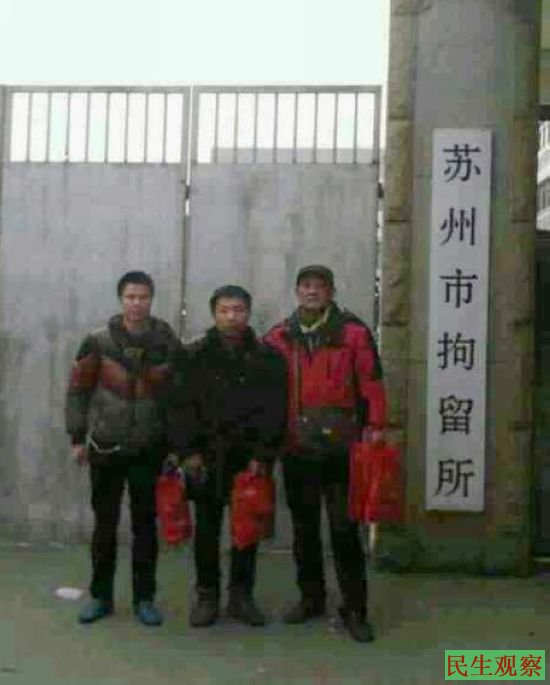 17:时许,本工作室收到现场维权人士尹旭安消息称,今天下午维权人士王健、柴金元、尹旭安、胡海波四人找到苏州市拘留所,给因声援范木根遭拘留的武汉五芳监号109、北京李文先监号108、福建孙涛监号303、黑龙江孙东生监号107、北京任键财(刘星)102送去防寒衣物及生活费用,但因拘留所声称内部不让消费拒绝接受。