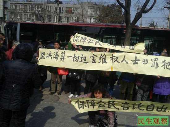 今日聚集在北京信访局上访的访民们,打出众多条幅,写有“彻查违法三级终结信访案件”、“保证公民言论自由、结社自由”、“关注民生”、“坚决清算一切迫害维权人士的罪犯”、“保障公民言论自由”等等。