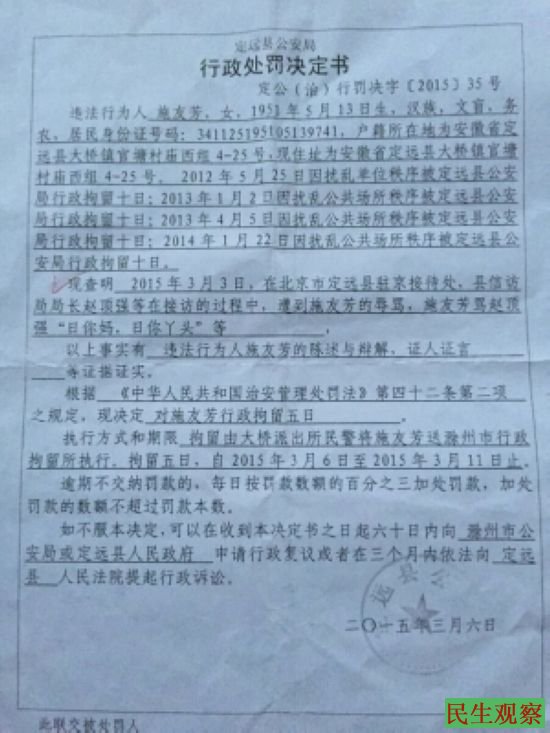 据悉,施友芳是3月3日被绑架进定远县驻京办事处,3月6日接访人员强制把她带回原籍,定远县公安局以施友芳公然侮辱他人为由决定拘留其5天。到医院例行体检时查出施友芳有严重的高血压和糖尿病,随留院治疗。3月10日施有芳病情好转后,定远县公安局将施友芳送到滁州市拘留所执行拘留。