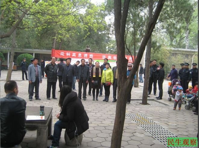 公园里,孙中山先生的全身塑像被宣传非法集资的大条幅遮挡。这塑像前仅一亩地左右的小广场上,早有一批表演花鼓的老太太占领。从领头的老太太给自称某派出所警员的便衣人员找零钱算帐的事实可见,这花鼓队是被特意请来的。