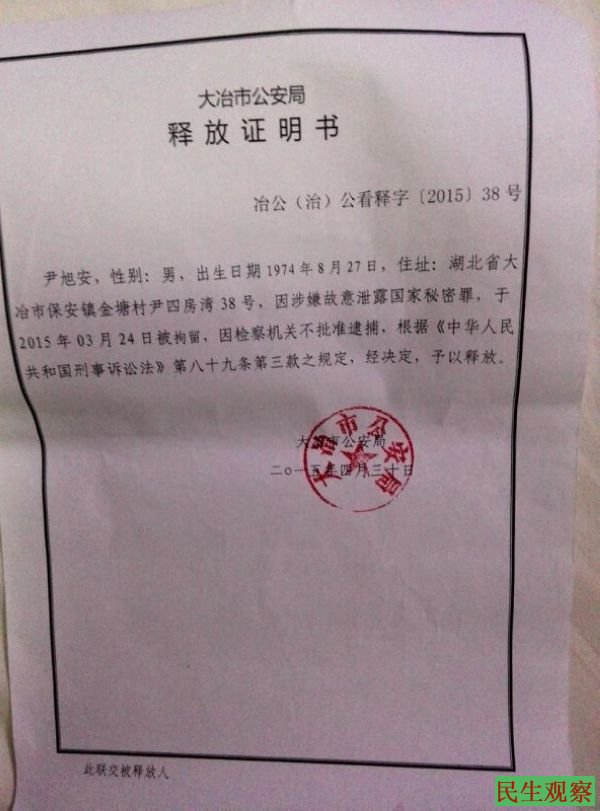 民生观察工作室2015/4/30消息:据武汉维权人王芳给本工作室发来消息,湖北大冶维权人士尹旭安于今天傍晚18:40分被大冶市公安局无罪释放。释放的原因是检察院不予批捕。