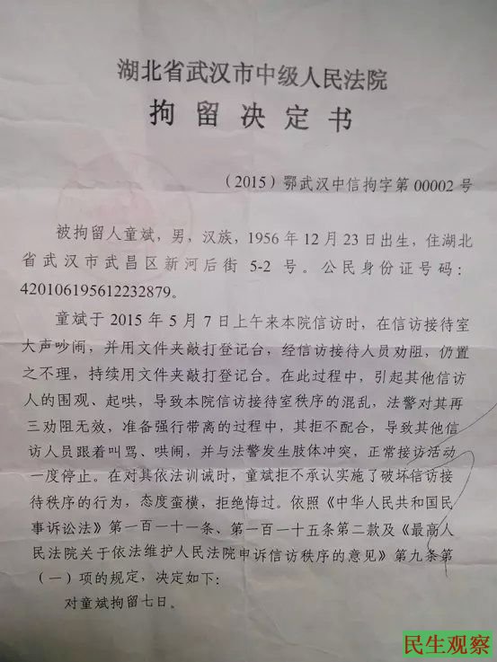 武汉市法院对童斌造成了伤害,现在他要求家人为他申请复议,进行申诉!