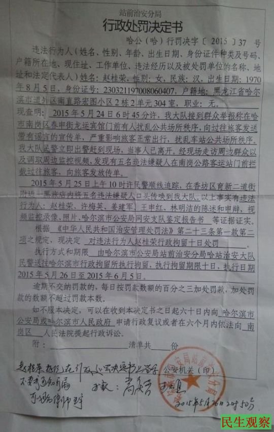 民生观察工作室2015/6/6消息:5月24日,哈尔滨赵桂荣、沈阳许梅英和林明洁、大连姜建军、湖北恩施王申红几名来自全国各地的维权人在哈尔滨站前广场等地打手写标语,揭露央视等有关部门关于徐纯合案造假,要求还原事实真相,结果于5月25日被哈尔滨治安分局以“散发传单““扰乱公共秩序”为由抓捕,五人均被拘留十天。今天赵桂荣等拘留期满已获得释放,王申红被湖北当地公安带回了湖北。