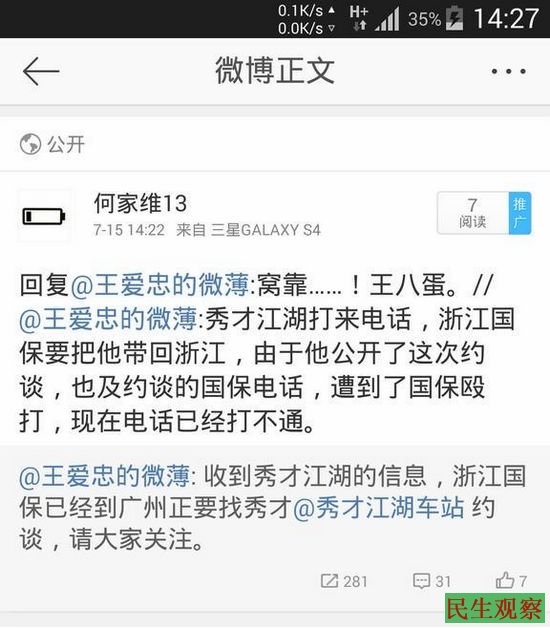 此外,维权人士“秀才江湖”今天被警方约谈,期间遭国保殴打,打人国保电话:18857263566。本工作室下午致电“秀才江湖”时,其电话已经无法接通,而致电国保电话多次都无人接听。