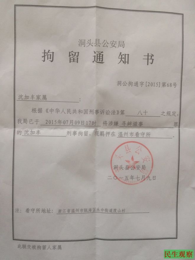 浙江洞头县访民沈加丰被以寻衅滋事罪刑拘 |
