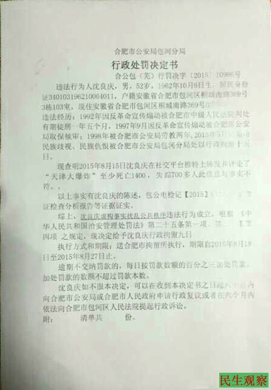 民生观察工作室2015/8/19日消息:安徽异议人士沈良庆昨日下午五点被警方以“虚构事实、扰乱公共秩序”为由传唤带走,今日家属接到通知,他被处罚行政拘留9日。