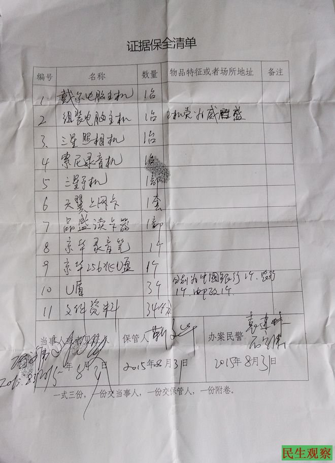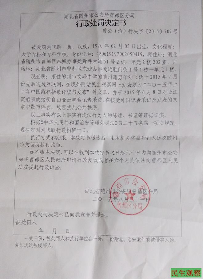 其实一个月前曾都区公安分局治安大队和市区二级国保人员就对刘飞跃进行了传唤,重点针对的就是民生观察发布不久的《二0一五年上半年中国维稳指数评议与发布》,当时就向刘出示公告将进行处罚。