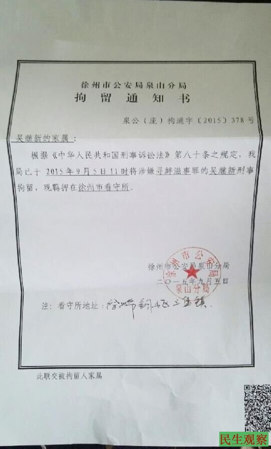徐州市公安局出具的拘留人员家属通知书上显示,吴继新被以涉嫌寻衅滋事罪于9月5日刑拘,关押在徐州市看守所,而这之前被关押地点警方未予透露。