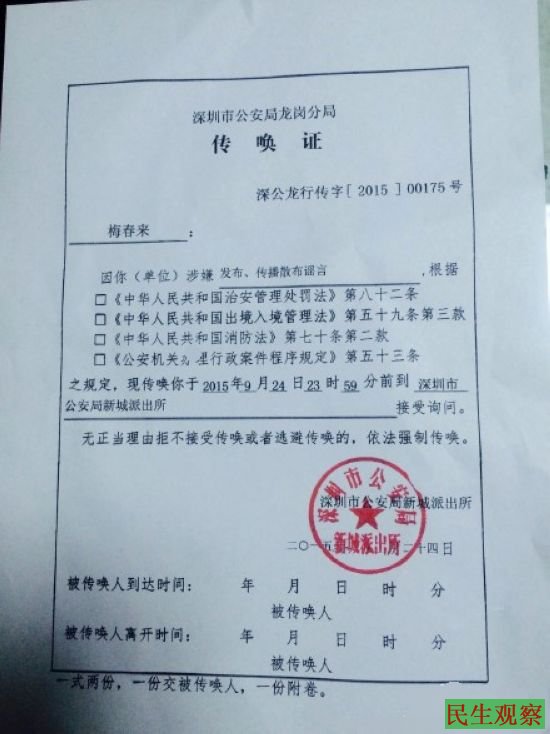 据悉,深圳市梅春来律师多年从事行政诉讼案,后他将自己的办案经验总结,撰写并发布了一篇《集体性维权如何避开警方设置的执法陷井》的文章。为此,深圳市警方就以其“散布谣言”为由进行传唤。