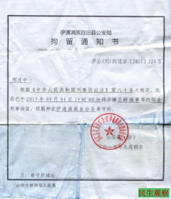 民生观察工作室2015/10/5消息:吉林伊通满族自治县访民邹金因在京上访,9月4日当地政府将其截回原籍后被伊通满族自治县以寻衅滋事罪刑事拘留,9月30日被检察院以敲诈勒索罪批准逮捕,现关押在伊通满族自治县看守所。