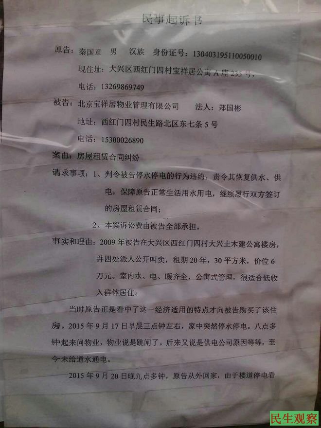 民生观察工作室2015/11/14消息:今天早上,居住在北京市大兴区宝祥居的孙先生紧急致电本工作室说他邻居秦国章律师在家突然死亡了。而宝祥居因拆迁,近期居民被断水断电,断水断电后秦律师等居民不得不在家使用煤炉子,为此秦国章律师正在起诉该小区物业公司。