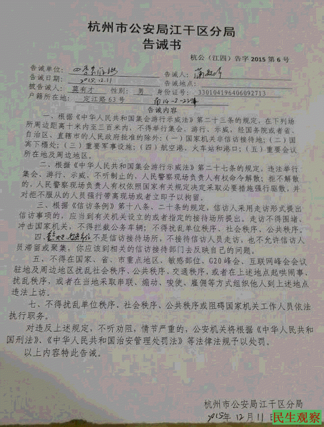 据陈美佳了解,几乎在同一时期浙江多位访民受到了同样的告诫,有的还收到了告诫书。包括杭州市江干区笕桥镇弄口村5组胡慧芬、江干区九堡镇杨公村强拆户冯国君、莫有才等,官方都告诫他们根据游行集会示威法,不得在重点地区、敏感地区、G20峰会、互联网峰会驻地及周边地区扰乱社会秩序。