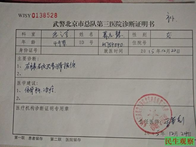 民生观察工作室2015/12/24消息:12月22日,北京维权人士葛志慧,到北京第二中级人民法院围观浦志强案被打伤,经武警北京市总队第三医院诊断为,右膝前交叉韧带损伤。