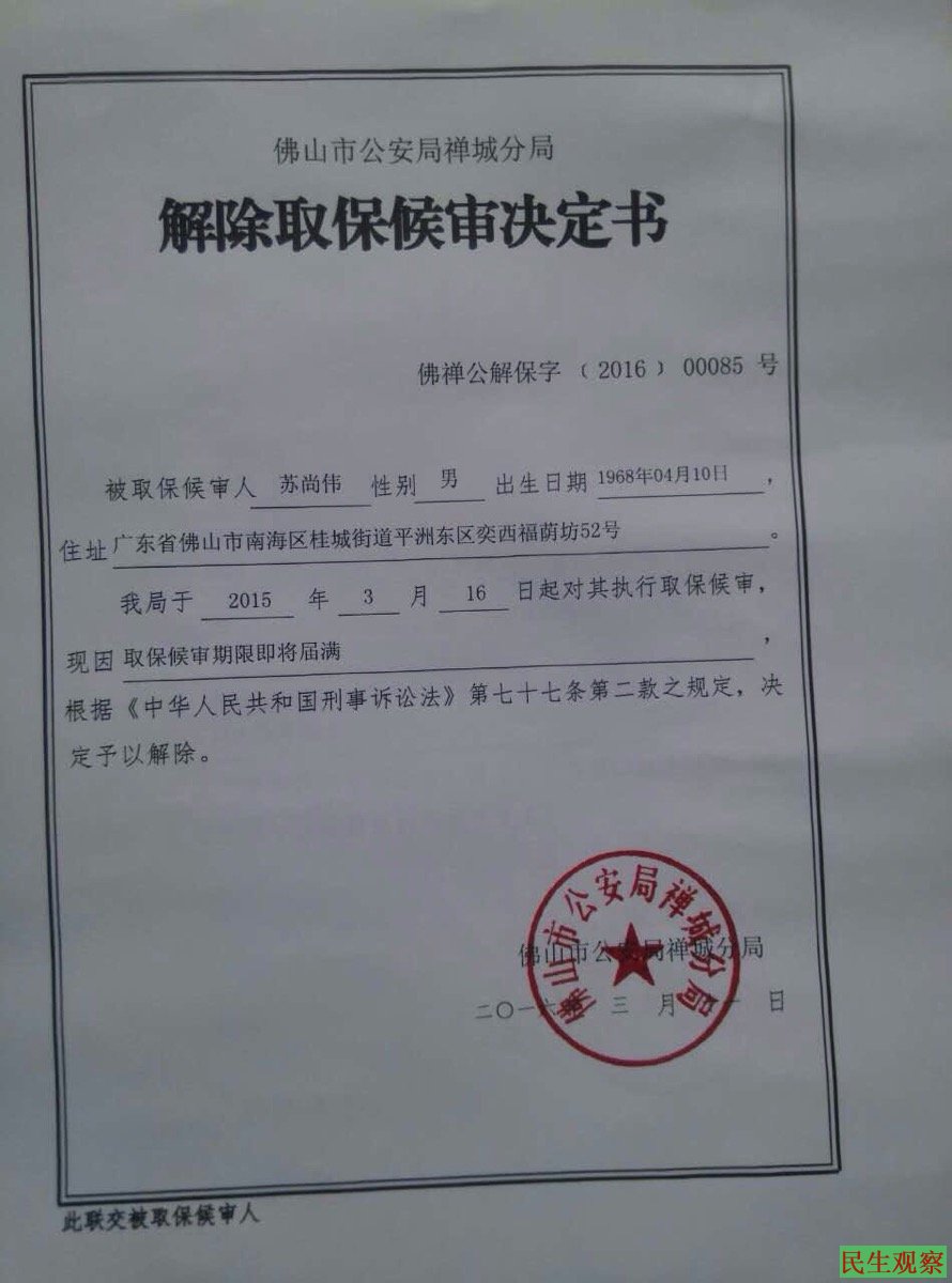 民生观察工作室2016年3月15日消息:苏昌兰哥哥苏尚伟被解除取保候审。