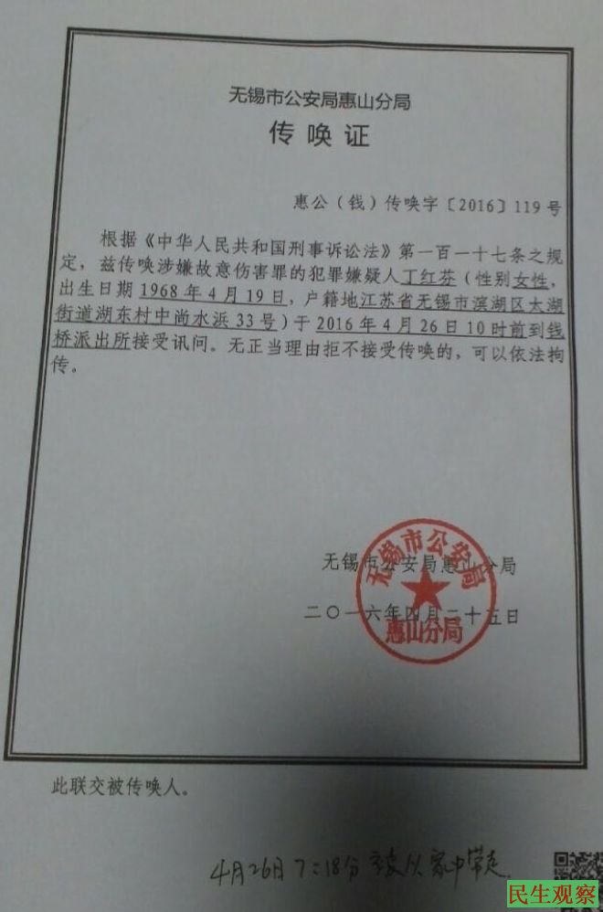 民生观察工作室2016/4/26消息:今天,2016年4月26日早上7点15分左右,江苏无锡维权人丁红芬被无锡惠山公安分局钱桥派出所传唤!丁红芬家属沈果冬说“现在人已被带走”。请大家关注!