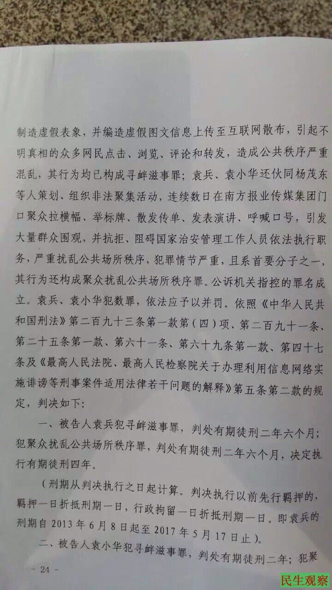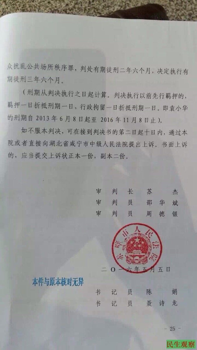 民生观察工作室2016年5月9日消息:赤壁袁小华、袁兵涉嫌寻衅滋事、聚众扰乱公共秩序罪一案今日在赤壁法院宣判,袁小华、袁兵二人均遭重判。