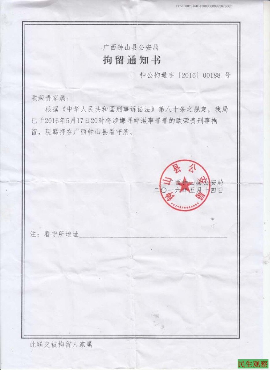 27号下午本工作室志愿者辗转电话联系了欧荣贵的姐姐欧玉林,她告诉本工作室,弟弟欧荣贵是被广西钟山县警方带走的,昨天家里已经收到刑事拘留通知书,说是涉嫌寻衅滋事罪,被关在钟山县看守所,当时警方跨市到桂林家中抓的人,其他情况欧玉林也不清楚。