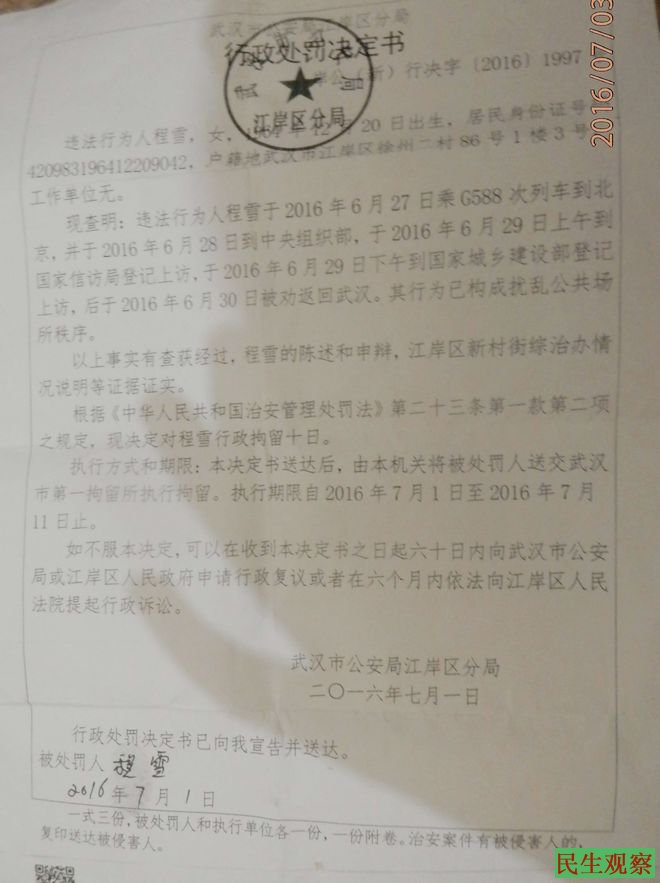 武汉访民程雪、沈阳访民林明洁七•一期间分别被拘留 |