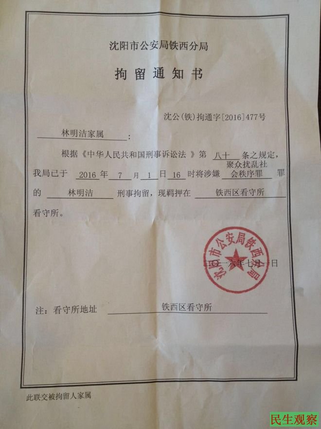 沈阳访民林明洁的哥哥林明华也于这二天给本工作室发来消息说,沈阳霁虹派出所副所长杨军红告诉他,林明洁6月27日在北京西单“走动”了,29日又到了北京六部口。7月1日被押回沈阳的林明洁,即被沈阳市公安局铁西分局以涉嫌“聚众扰乱社会秩序罪” 刑事拘留了,现关押在铁西区看守所。