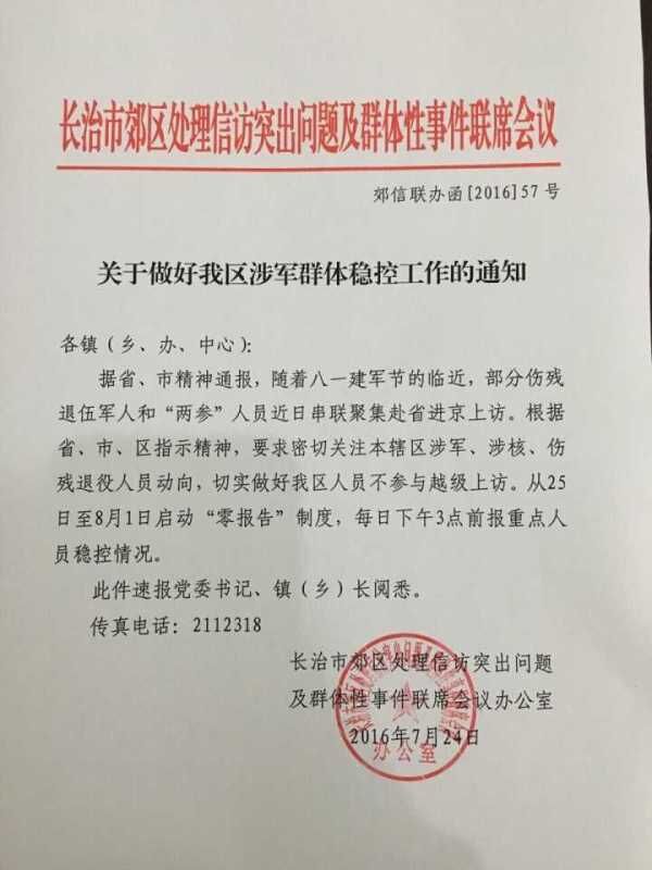 )的消息。今天,我们又注意到山西退伍军人发出的一份长治当局关于对涉军群体加强稳控的通知。