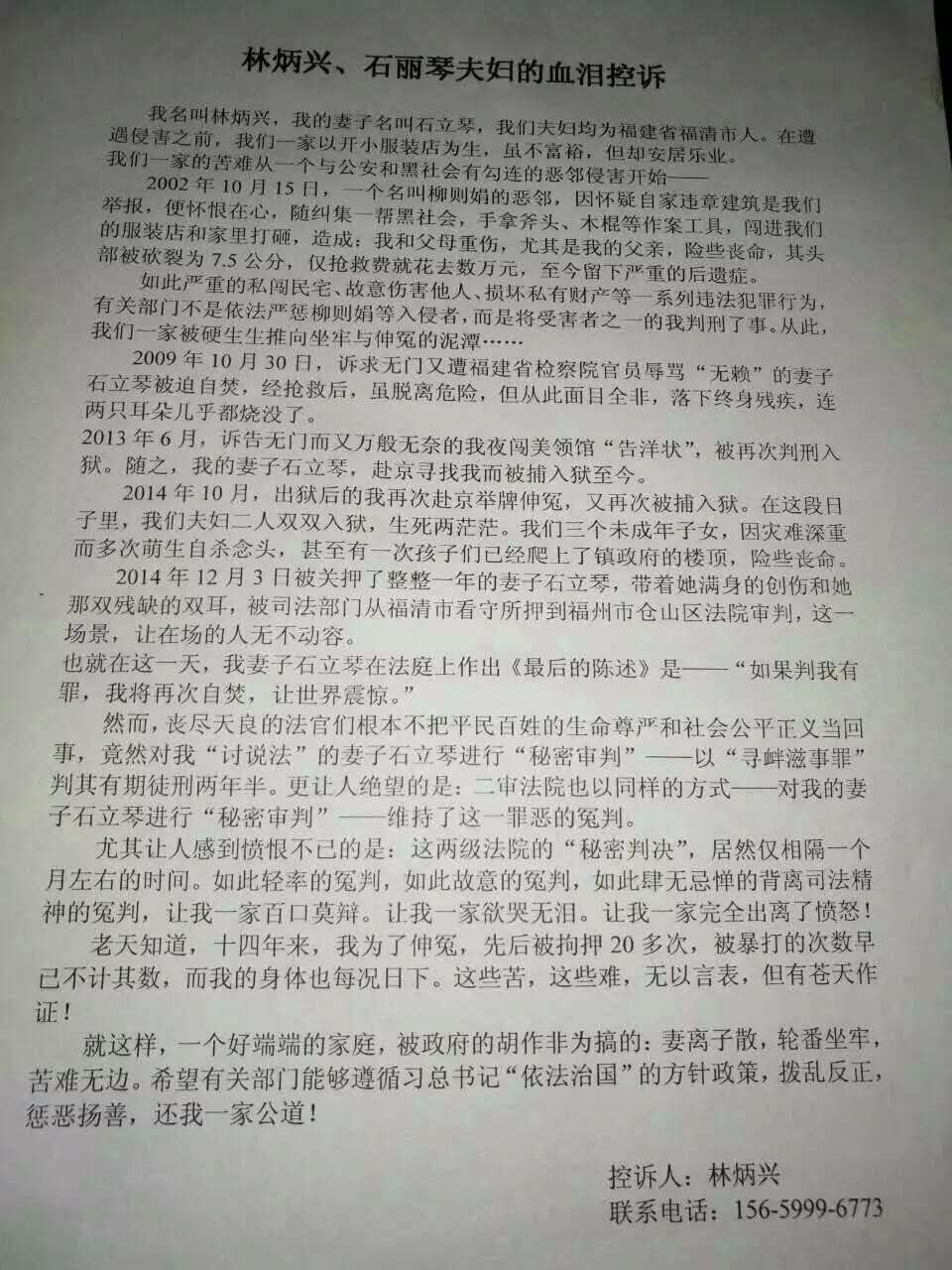 林炳兴一家不服判决上访被多次拘留、判刑。2009年10月30日,诉求无门的石立琴又遭福建省检察院官员辱骂“无赖”被迫自焚抗议,随经经抢救脱险,但从此面目全非,落下终身残疾,两只耳朵几乎都烧没了。