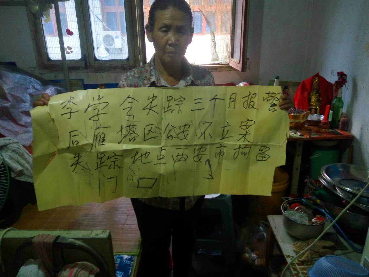 昨天早上9点多,曹秀琴和儿子李启红向西安市雁塔区长延堡派出所报警,长延堡派出所值班女民警对曹秀琴讲,你女儿是成年人,不够失踪条件,只有小孩、老人失踪后民警帮忙找寻。我只能把你们拿的寻人启事给你发到公安网上帮你联系,人如果我们找到了给你打电话。也没给她们受案回执单。