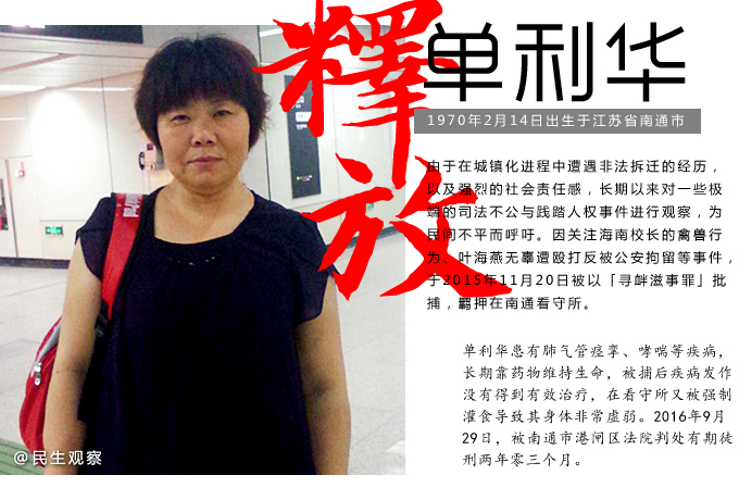 民生观察工作室2016年9月29日消息:江苏南通维权人士单利华寻衅滋事罪一审宣判获刑两年零三个月。