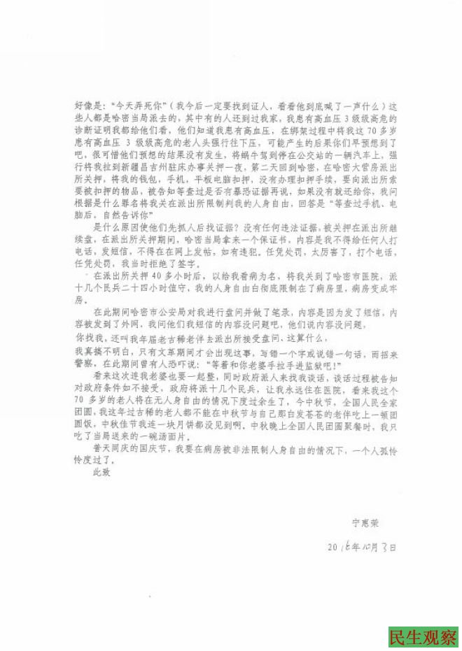 新疆70岁访民宁惠荣讲述中秋国庆期间被关押