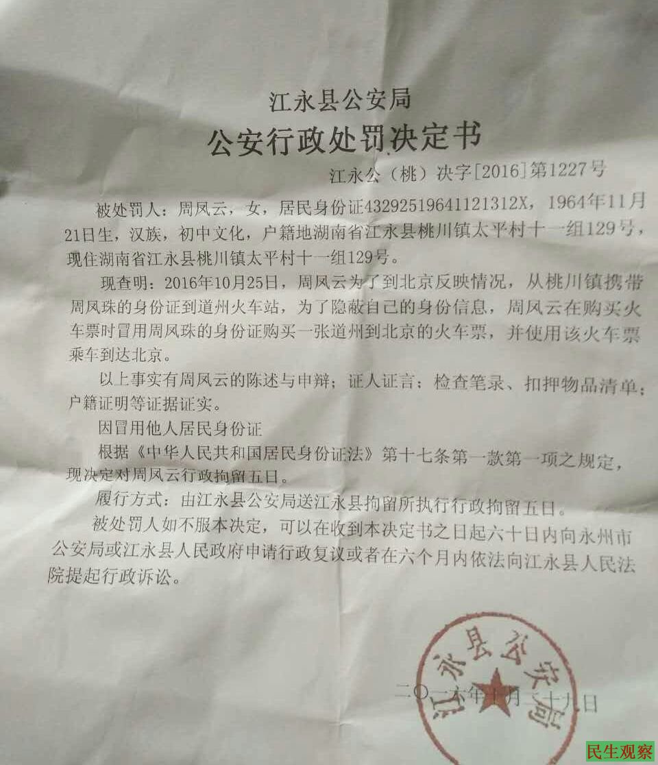 前天,民生观察网发布了湖南省江永县访民被押拘留所(http://www.aaa.aetdhfjgk.cf/a/lanmu1/2016/1029/15122.html )的消息。今天,周凤云的女儿周娟球给民生观察人权观察员发来了周凤云的公安行政处罚决定书,证实周凤云被拘留五日。