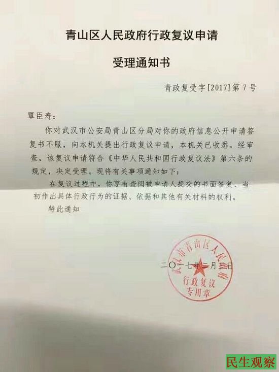 [民生观察工作室2017/02/07消息]覃臣寿律师于今日(2月7日),收到武汉青山政府的行政复议受理通知书。此前,他申请公开“赵素利失踪案”的相关信息,被青山警方以不符合规定为由拒绝。