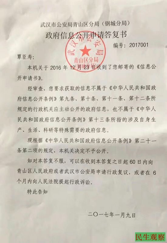 今年1月,覃臣寿收到青山区公安分局的答复书,称所要求获取的信息,不属于《政府信息公开条例》规定的范畴,不予公开。随后,覃臣寿对答复不服,向武汉市青山区政府申请行政复议。
