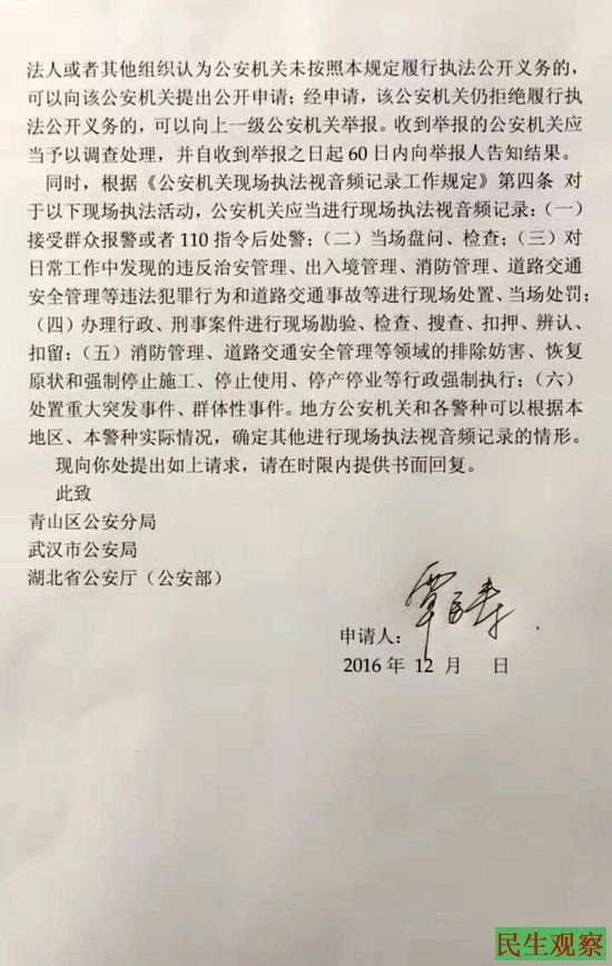 去年12月,覃臣寿受赵素利家属委托,向武汉市青山区公安分局申请政府信息公开。内容包括:赵素利是否被采取刑事强制措施、能证明人身安全的录音录像、告知案件主办单位、告知所有换押的程序性法律文书等八项。