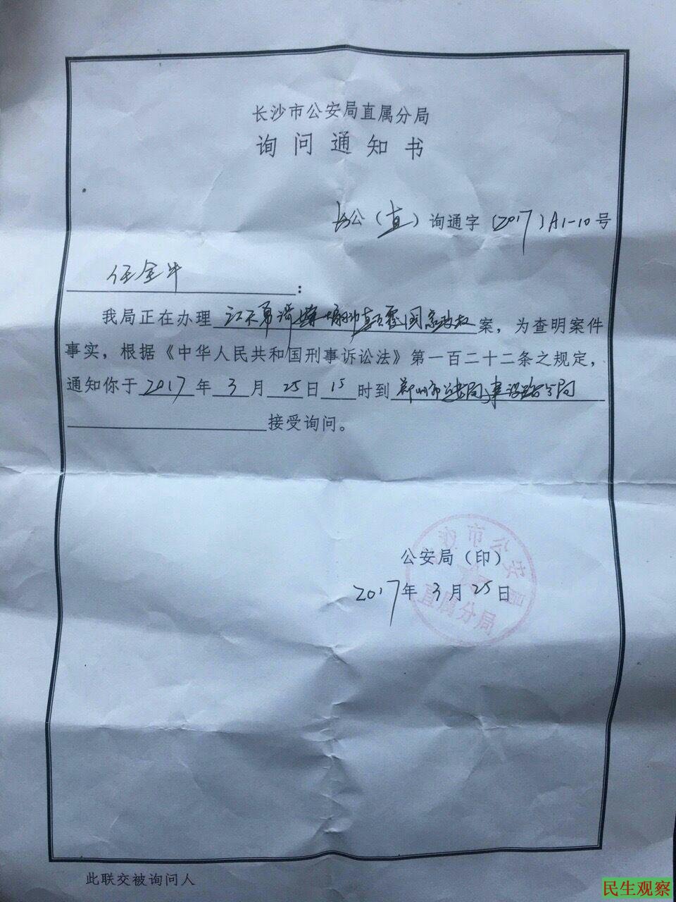 本网联系了任全牛律师,得知今天下午长沙市公安局直属分局侦察员屈可和胡定康持“询问通知书” (图)对任全牛做笔录,具体询问有关江天勇的情况。任全牛坦言,自己能被长沙公安局归为与“江天勇案”有关感到很荣幸,不过自己以往并未与江天勇律师有过共同办案的经历,私底下来往也不多,关系并不熟络,以至于令特意前来的长沙警察有些失望。
