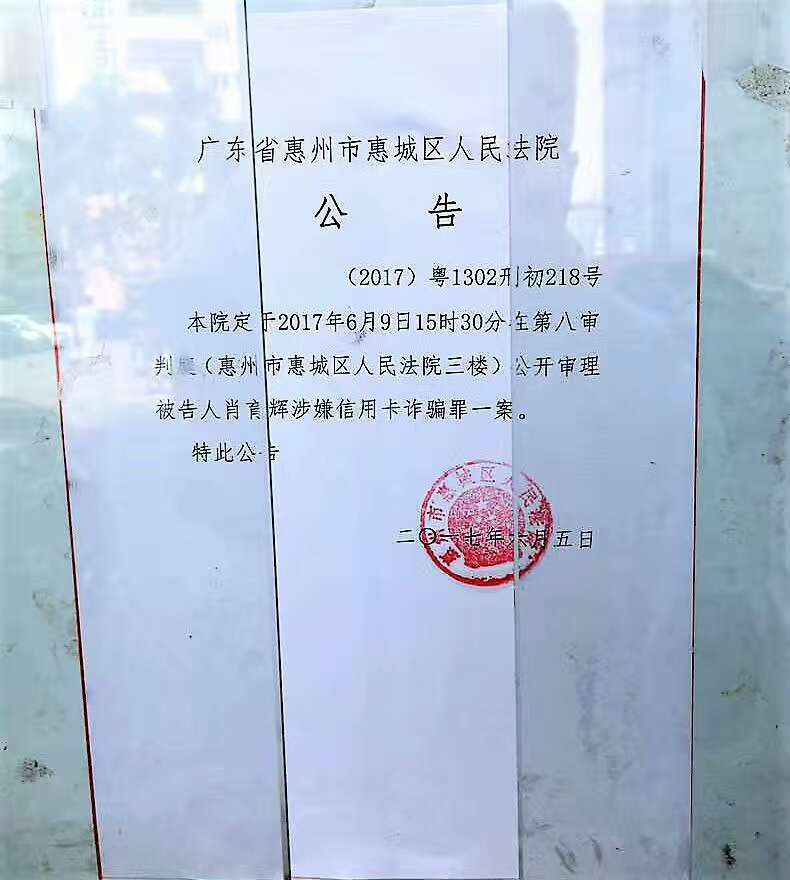 【民生观察工作室2017年6月10日惠州消息】昨天下午三点半,广东省惠州市惠城区法院开庭审理肖育辉涉嫌信用卡诈骗一案,庭审仅用90分钟走完程序,休庭30分钟,最后宣判结果,肖育辉被判处有期徒刑九个月,缓刑一年,罚款20000元。