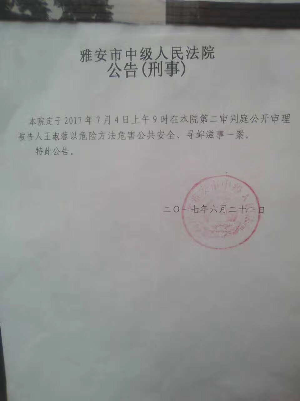 【民生观察工作室2017年7月4日消息】今天(7月4日)上午九点,四川雅安市中级法院开庭审理“六四天网”义工王淑蓉涉嫌“危险方法危害公共安全、寻衅滋事”一案(二审,一审判决有期徒刑六年),庭后法院宣布维持原判。