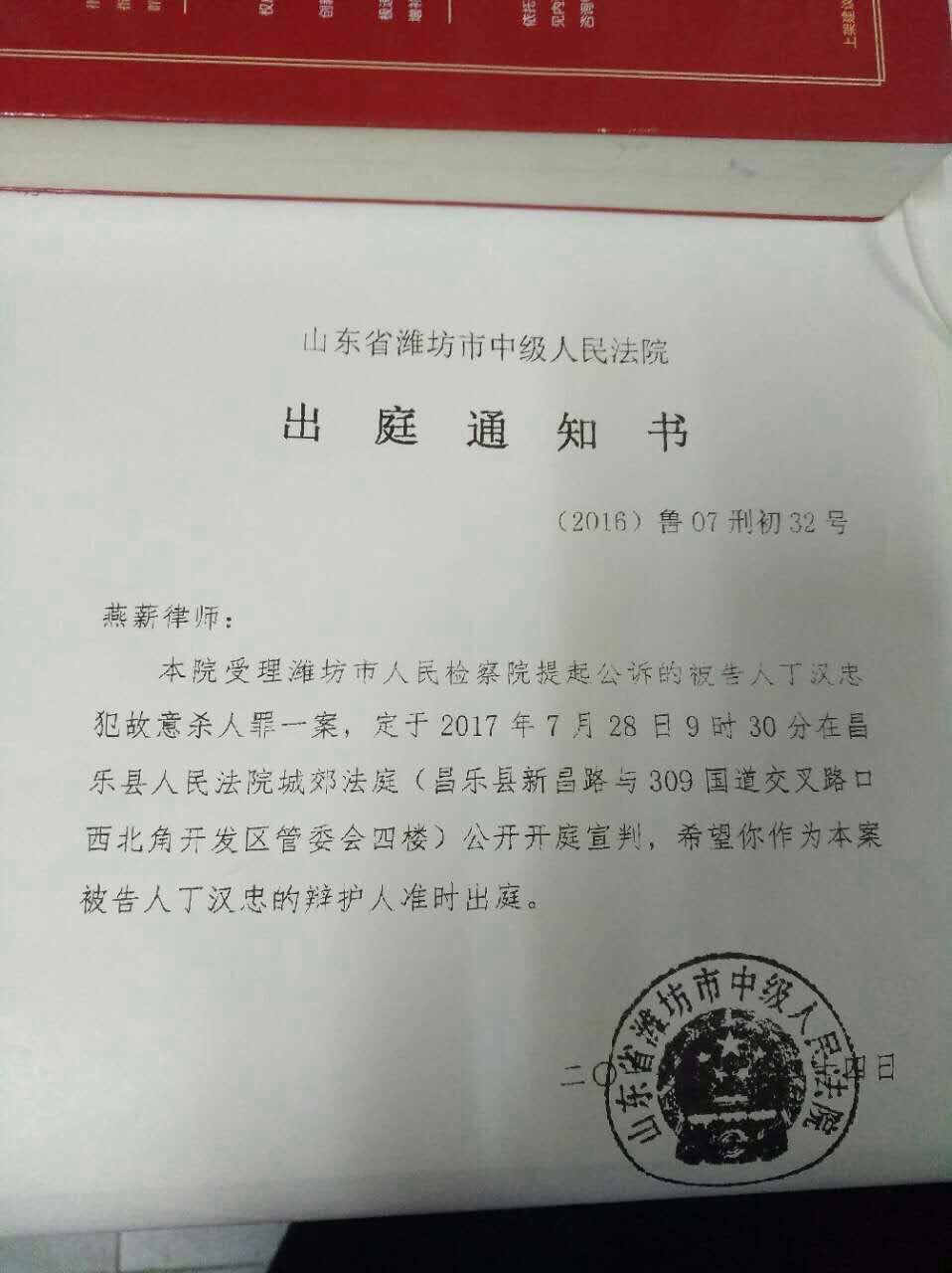 【民生观察2017年7月26日消息】本网获悉,辩护律师收到法院法官的通知,原定于7月28日在山东潍坊昌乐县城郊法庭开庭的丁汉忠案宣判取消,将延期开庭宣判,具体开庭时间未定。