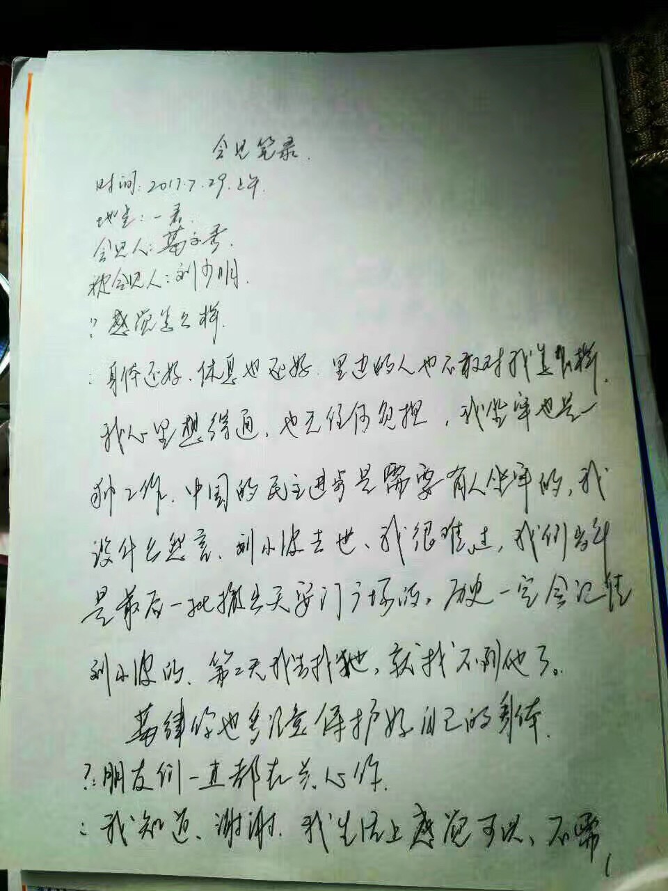 葛文秀律师对会见作了笔录,刘少明表示,自己比较想得通,也无任何负担,觉得坐牢是一种工作,中国的民主进步就需要有人去坐牢的,并称自己没有怨言。对于刘晓波的辞世,刘少明表示很难过,历史一定会记住刘晓波。