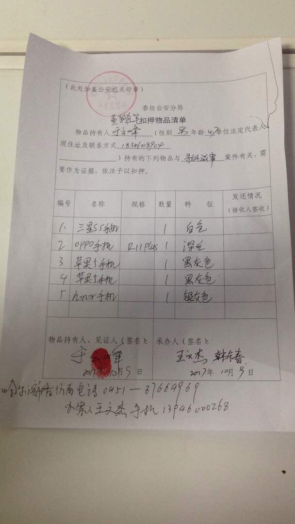据悉,昨日傍晚六点左右,于云峰的家中闯入七八名自称香坊区公安分局以及派出所的人员,在没有出示身份证件和传唤等法律文书的情况下,以“寻衅滋事”的罪名将于云峰带走,并在没有搜查令的情况下,对于家进行全方位搜查,抄走于云峰的四部个人手机以及于云峰姐姐的一部手机,警方人员只是对扣押的五部手机写了一份清单。在家属质问下,对方辩称扣押的手机都与于云峰的“寻衅滋事”案件有关。